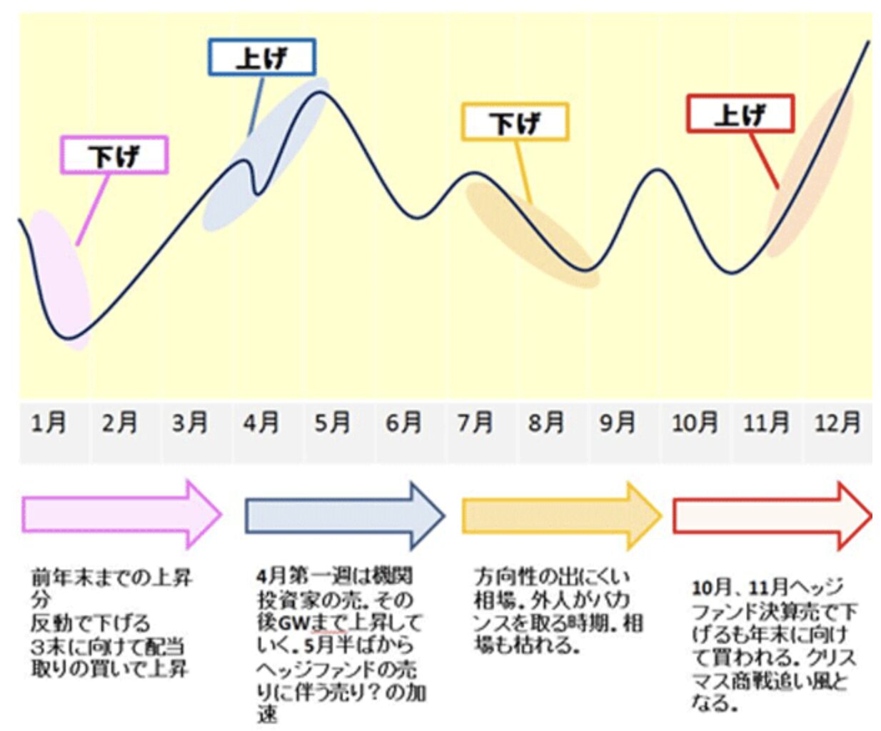3月末〜4月初めの下落は、配当を受けとった投資家が株を売るからといわれている。6~8月はアメリカが夏休みのため、株取引が減って株価が下がると考えられている